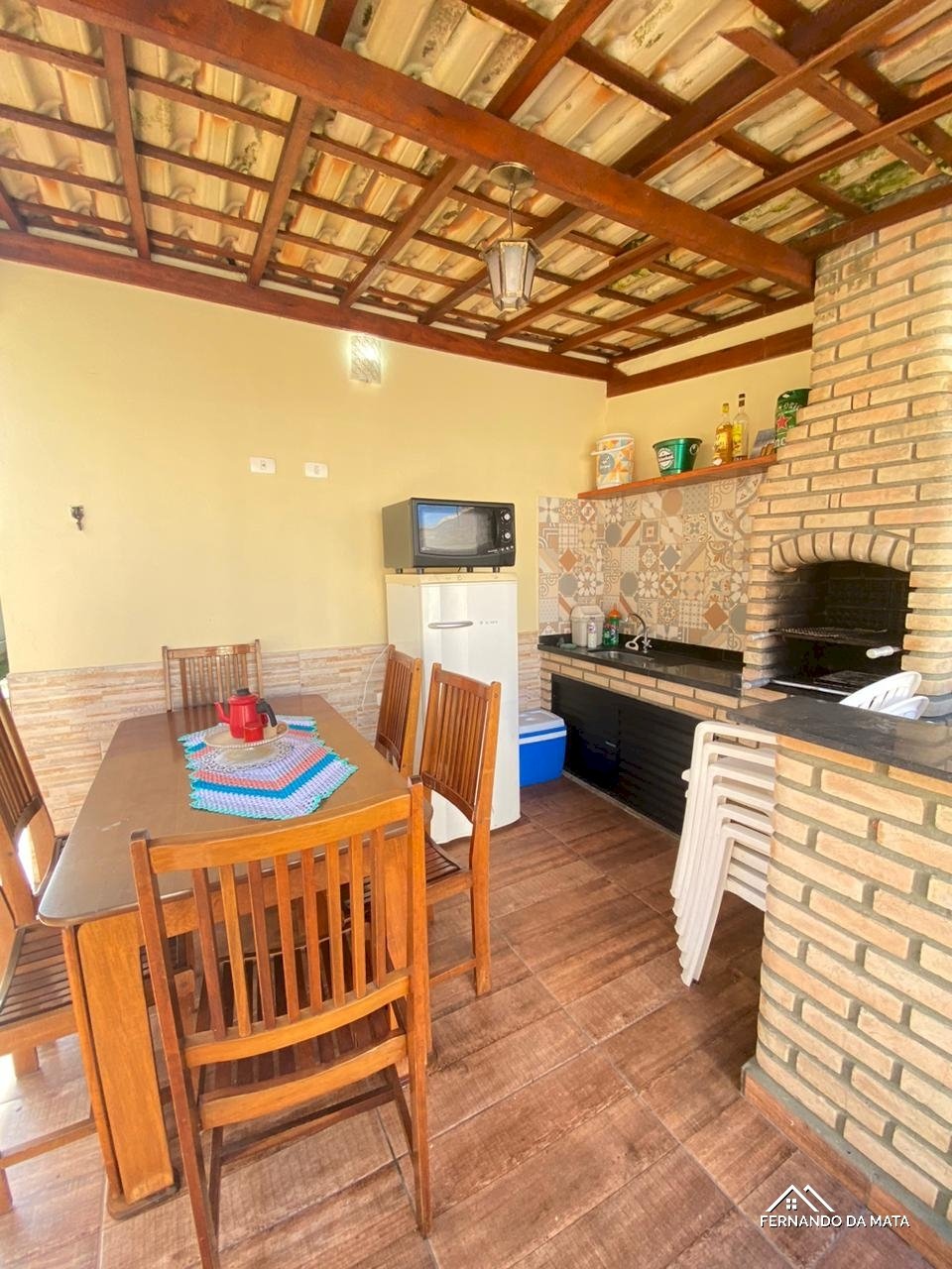 Área gourmet com churrasqueira, balcão em mármore e pia